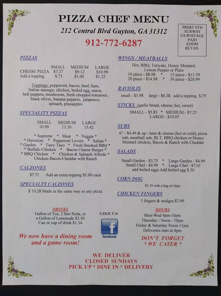 Welcome to Pizza Chef of Guyton, your local haven for pizza enthusiasts located at 210 Central Blvd, Guyton, GA. This family-run gem is dedicated to crafting mouthwatering pizzas and sides that highlight quality and passion. Their menu features a delightful array of specialty pizzas, each made with freshly prepared dough. The Fresh Smoked BBQ Pizza and Supreme Pizza are perfect for good ol' gatherings, while the Hawaiian Pizza offers a sweet and savory experience that stands out.